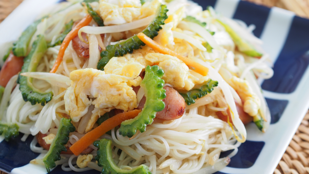 沖縄では、「そうめん=炒めて食べるもの」という文化が根づいています。定番料理は「そうめんチャンプルー」。茹でたそうめんを油で炒め、スパム・にんじん・ニラ・卵などを加えて仕上げる、ボリュームたっぷりの一品です。