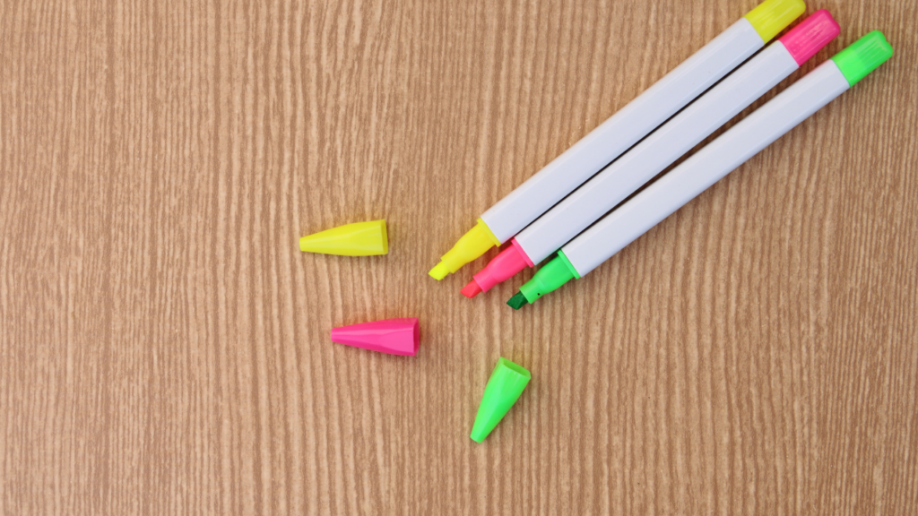 蛍光ペンには黄色・ピンク・緑・オレンジ・青など、さまざまな色がありますが、それぞれに**異なる蛍光染料(着色成分)**が使われています。